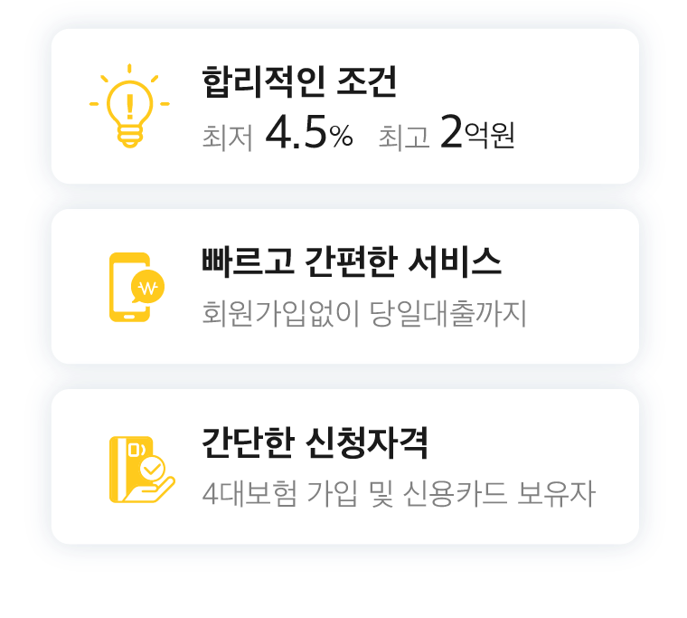 개인정보를 수집 및 이용하거나 제3자에게 제공하고자 하는 경우에는 「개인정보 보호법」 제15조 제1항 제1호, 제 17조 제1항 제1호, 제24조 제1항 제1호 및 「신용정보의 이용 및 보호에 관한 법률」 제 15조 제2항, 제32조 제1ㆍ2항 등에 따라 본인의 동의가 필요합니다. 이와 관련, 본인은 상담 서비스를 이용함에 있어 본사의 개인정보 수집 및 이용에 동의합니다. ▶ 개인정보의 수집 및 이용목적 - 본인식별, 실명확인 등 원활한 상담 서비스 제공 ▶ 수집하려는 개인정보의 항목 - 이름, 핸드폰번호 및 그 외 선택항목 ▶ 개인정보의 보유 및 이용기간 - 원칙적으로 개인정보의 수집 및 이용목적이 달성되면 지체 없이 파기합니다. - 단, 원활한 서비스의 상담을 위해 상담 완료 후 내용을 3개월간 보유할 수 있으며, 법령상 의무이행을 위하여 필요가 있는 경우에는 필요범위 내에서만 보존합니다. ▶ 개인정보를 제공받는 자 - 본사가 중개업무를 취급하는 은행 및 금융사 ▶ 개인정보를 제공받는 자의 개인정보 이용 목적 - 본인식별, 실명확인 등 원활한 상담 서비스 제공 ▶ 제공하는 개인정보의 항목 - 이름, 핸드폰번호 및 그 외 선택항목 ▶ 개인정보를 제공받는 자의 개인정보 보유 및 이용 기간 - 원칙적으로 개인정보의 수집 및 이용목적이 달성되면 지체 없이 파기합니다. - 단, 원활한 서비스의 상담을 위해 상담 완료 후 내용을 3개월간 보유할 수 있으며, 법령상 의무이행을 위하여 필요가 있는 경우에는 필요범위 내에서만 보존합니다. ※ 본사는 법률에 의거 필요한 범위 내 최소한의 개인정보만을 적법하게 수집 및 이용하고 있습니다. ※ 귀하는 상기 동의를 거부할 권리가 있으나, 동의가 없을 경우 본사의 상담 서비스 제공이 제한될 수 있음을 알려드립니다.